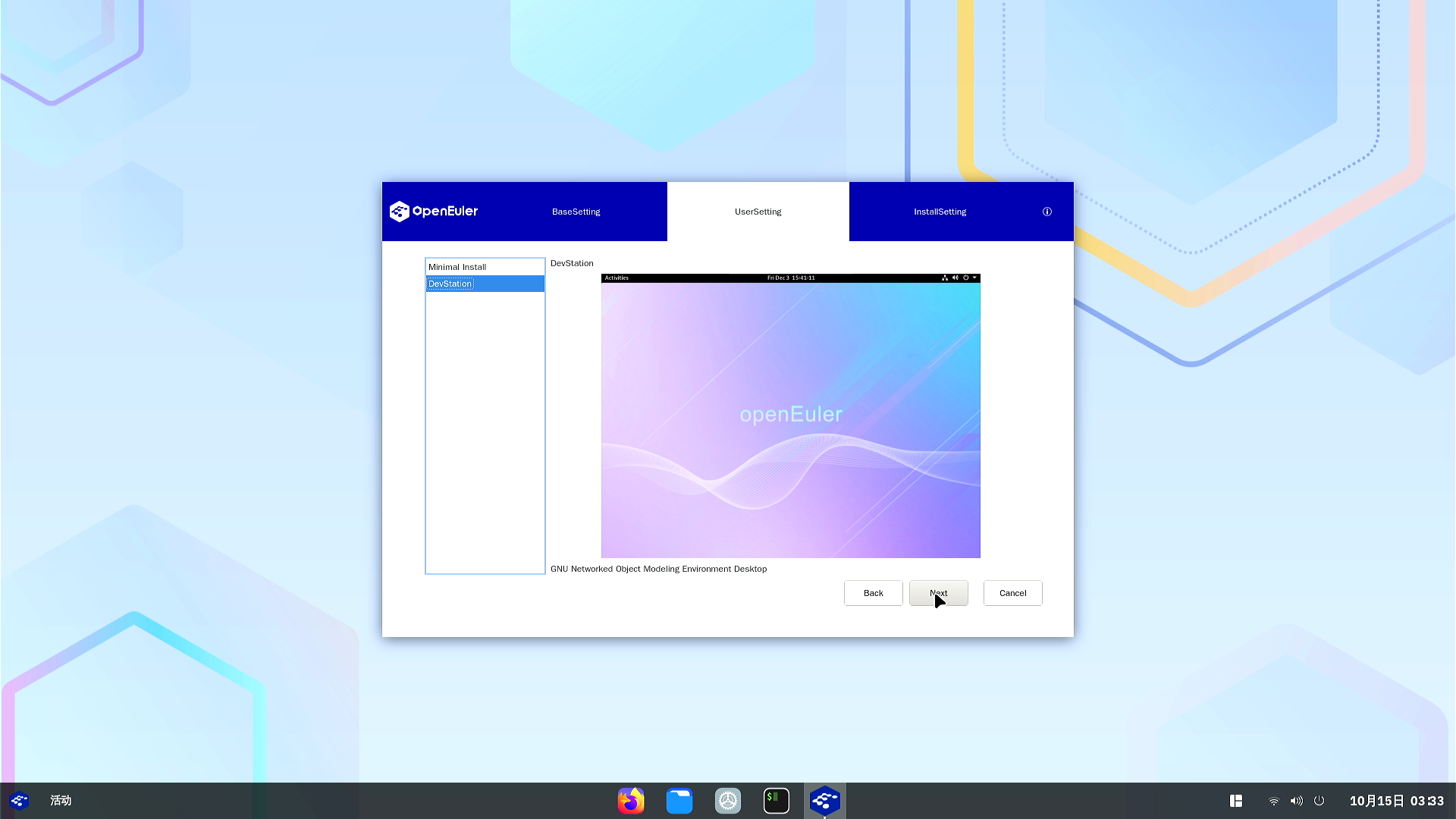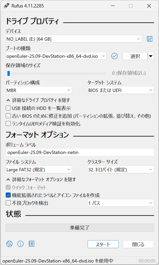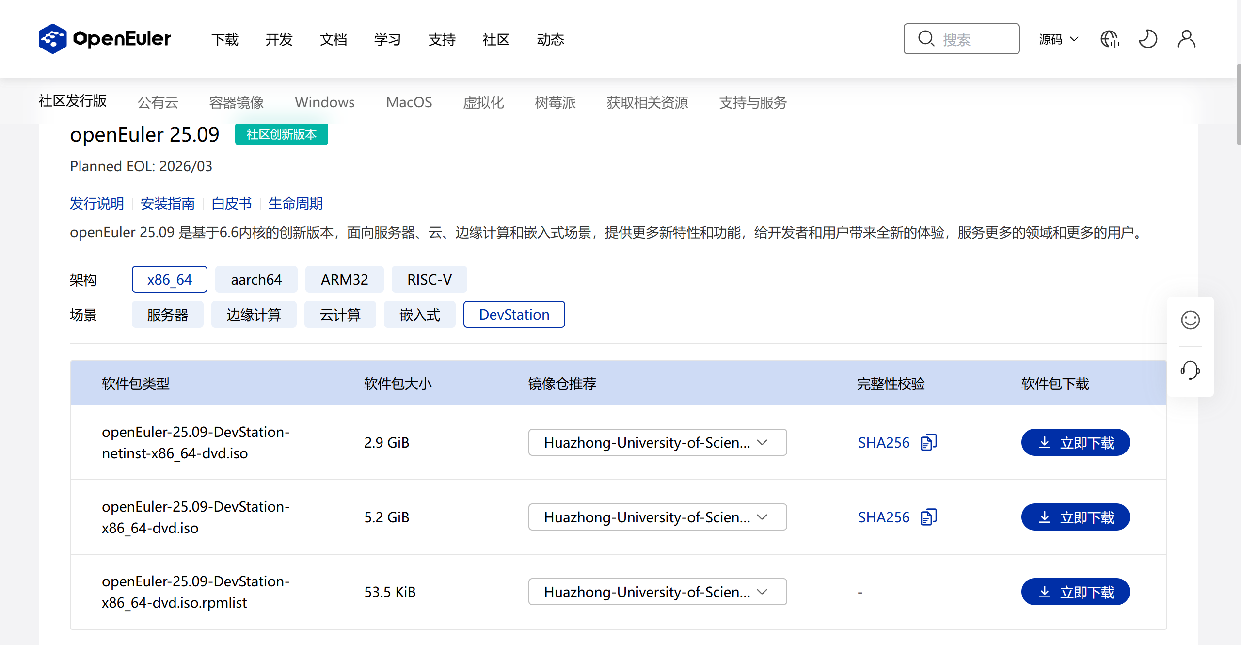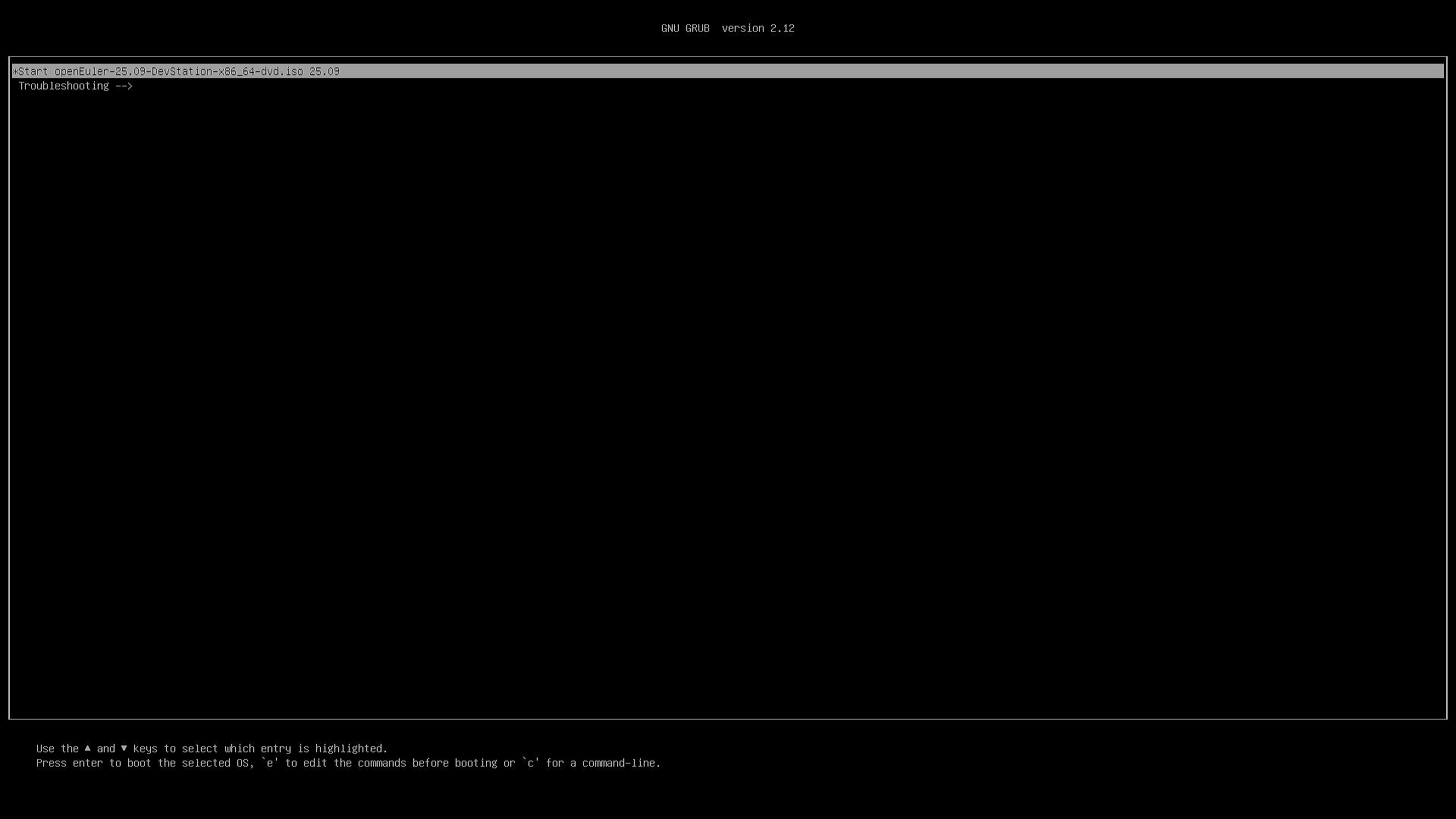 GUIありの openEuler-25.09-DevStation-x86_64-dvd.iso を選択。