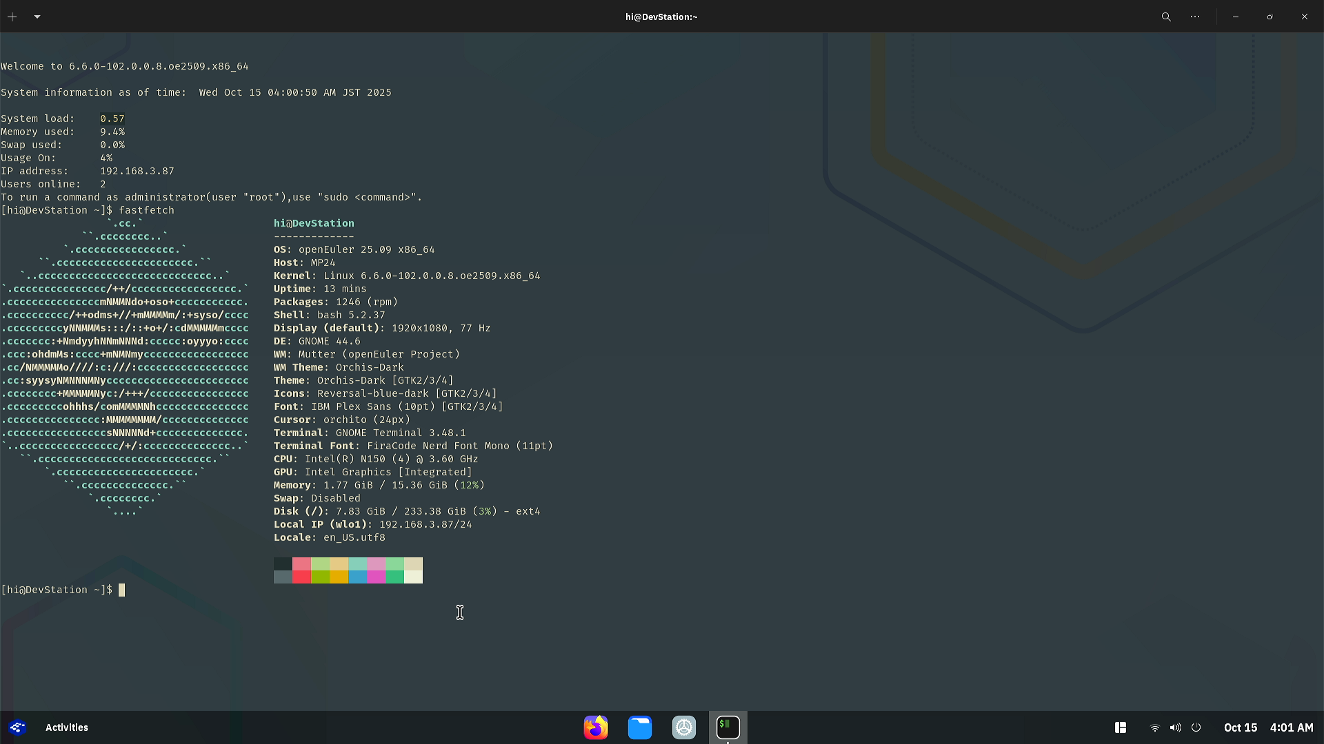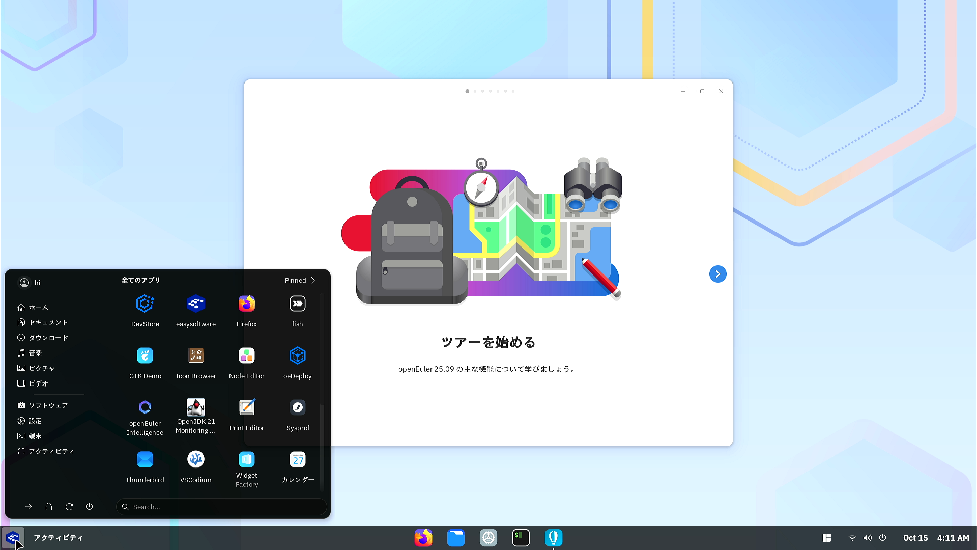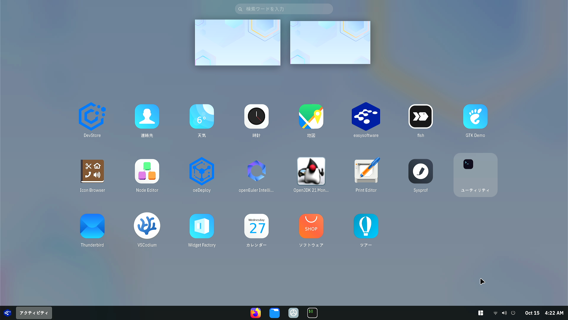 プリインストールのソフトウェアは少なめで、一応VSCodiumや謎のopenEuler付属機能が入ってます。