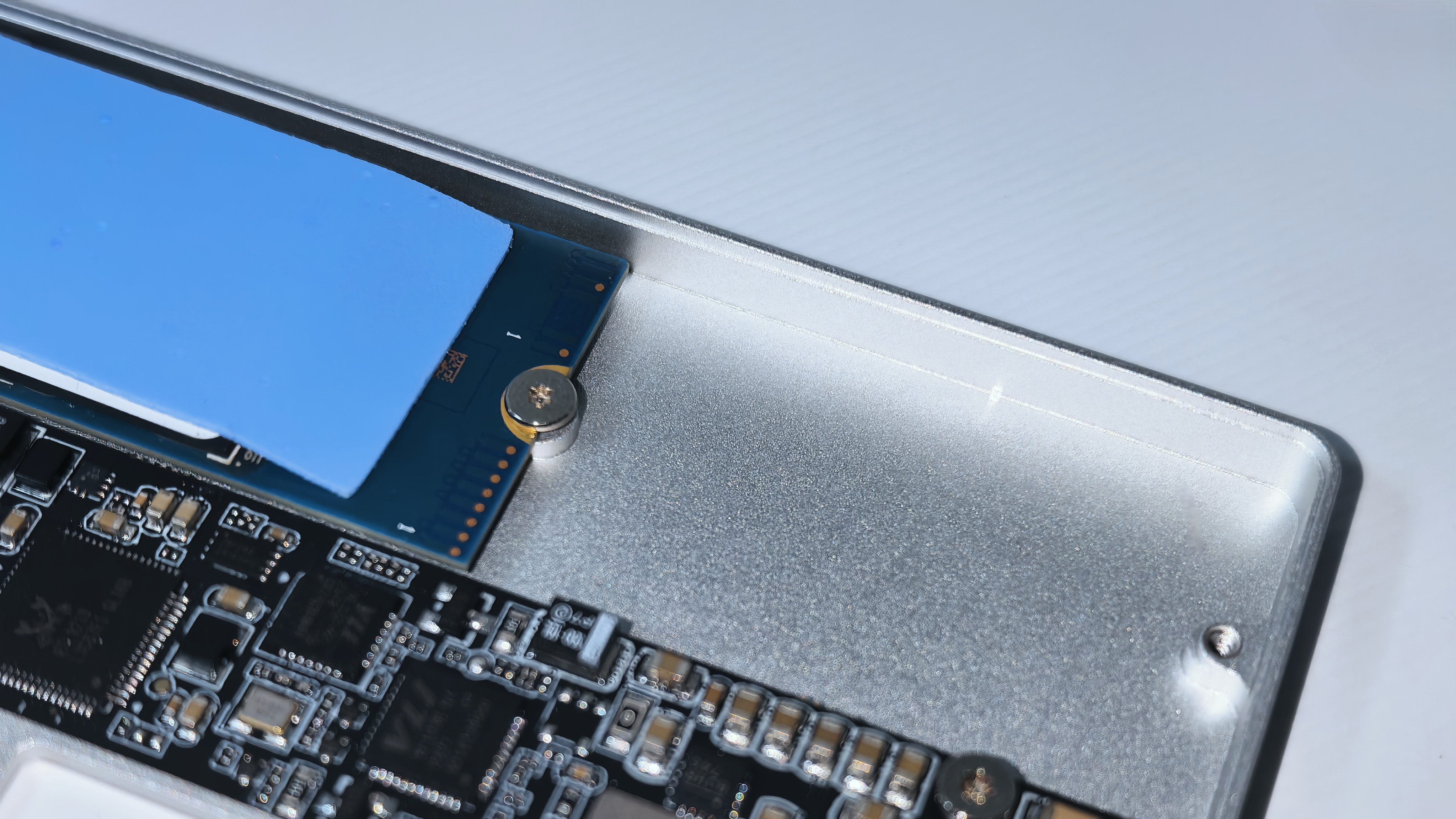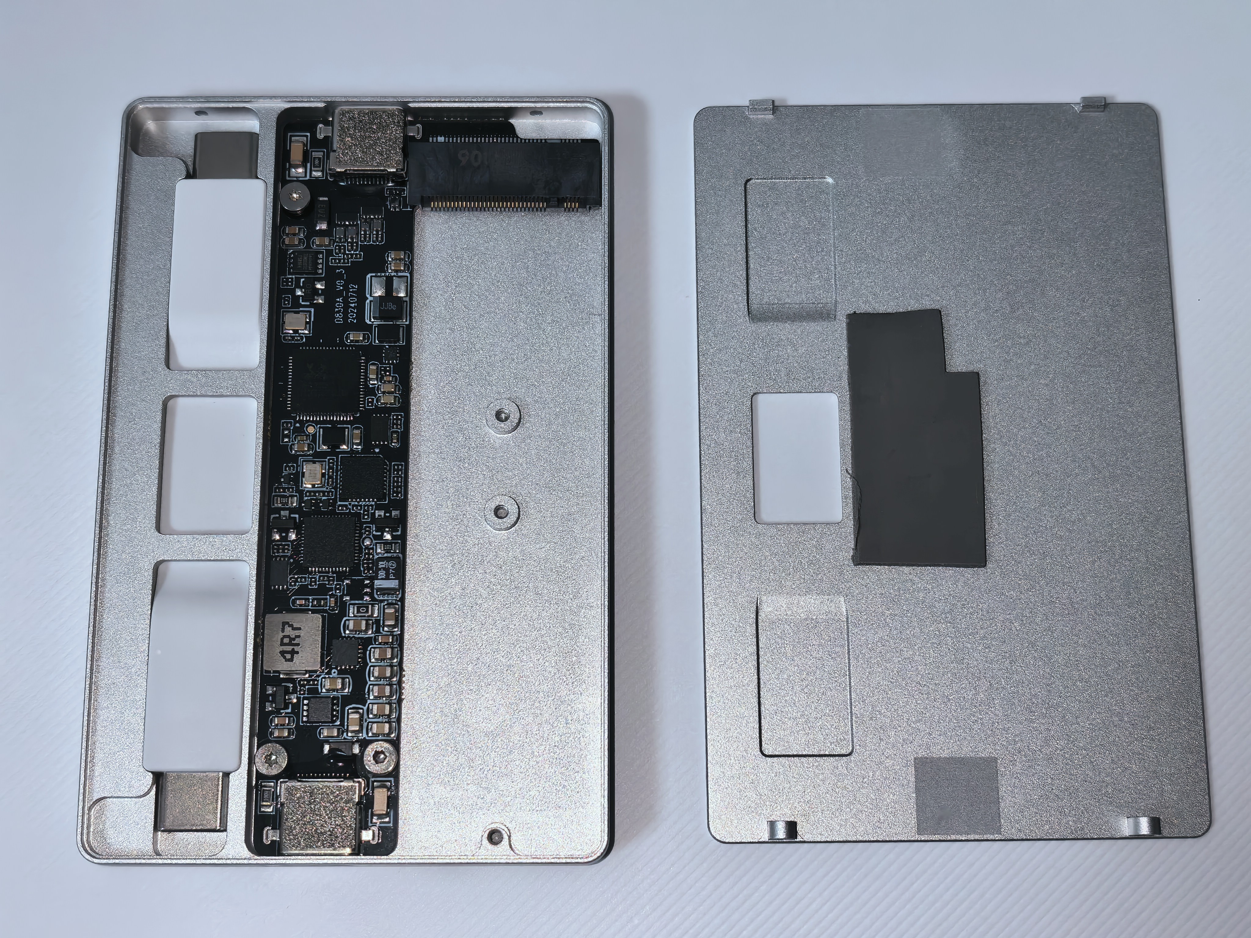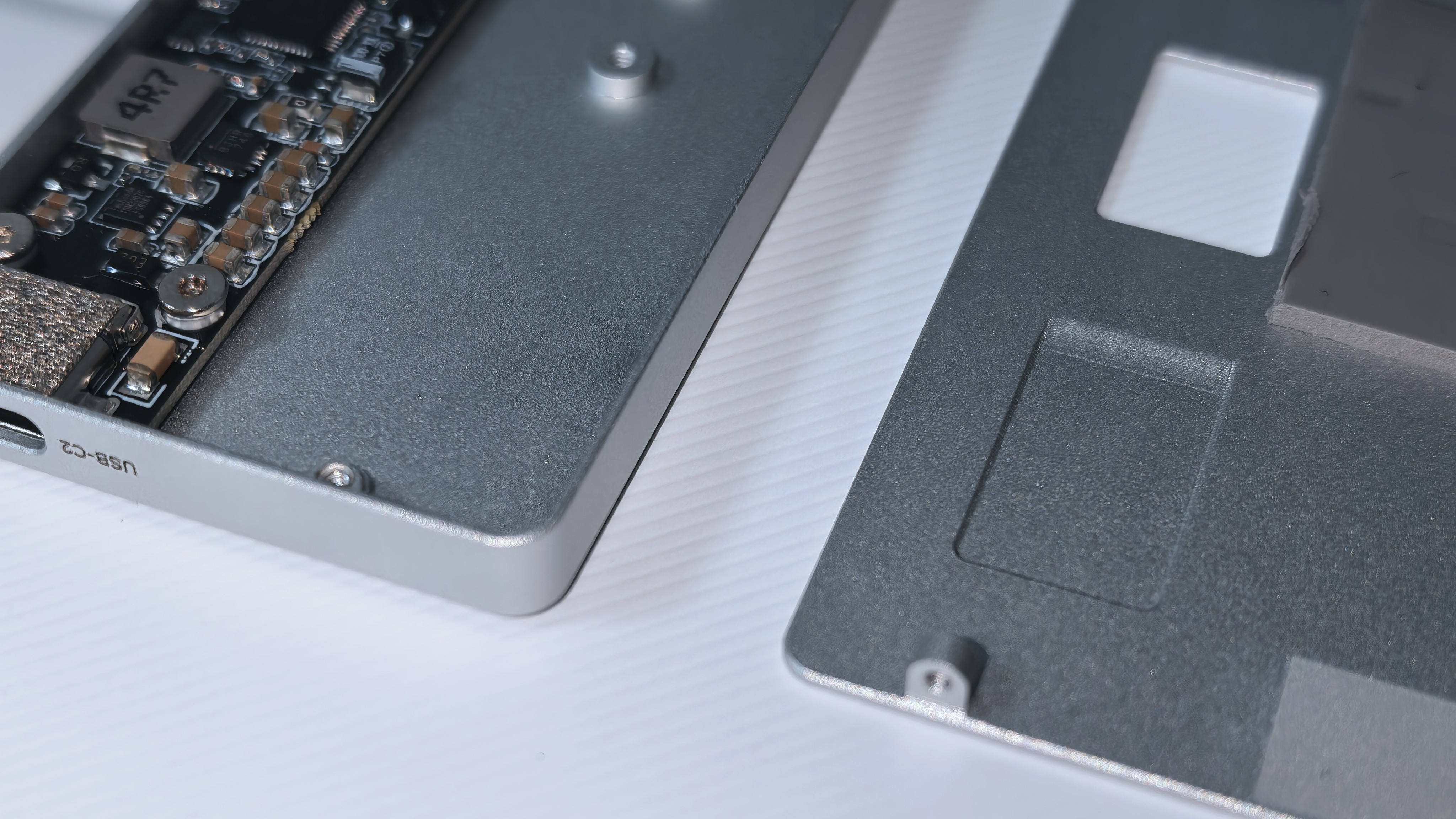 開いたときにアルミの薄さに若干の安っぽさを感じます。剛性が足りていないので、SSDとサーマルパッドの厚みによっては蓋の片側がやや浮いた状態になるなど、実害もあります。ここはもう少し頑張って、蓋の厚みを増やしてほしかったところ。
