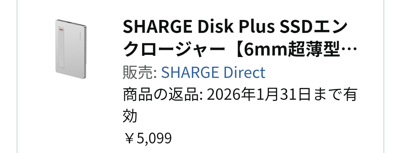 いつもは1万円するSHARGE Disk PlusというSSDエンクロージャーが、セールで5,000円まで下がっていたので買ってみました。