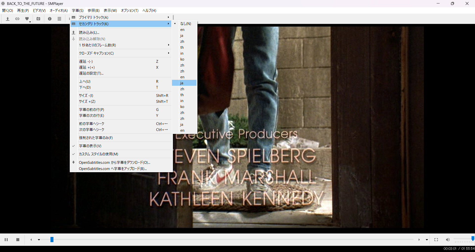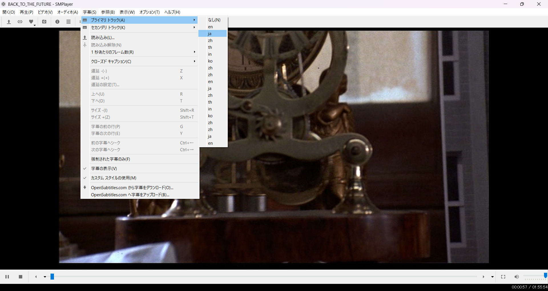 再生が始まったら、表示する字幕を選択します。今回は、プライマリトラックを日本語に設定。