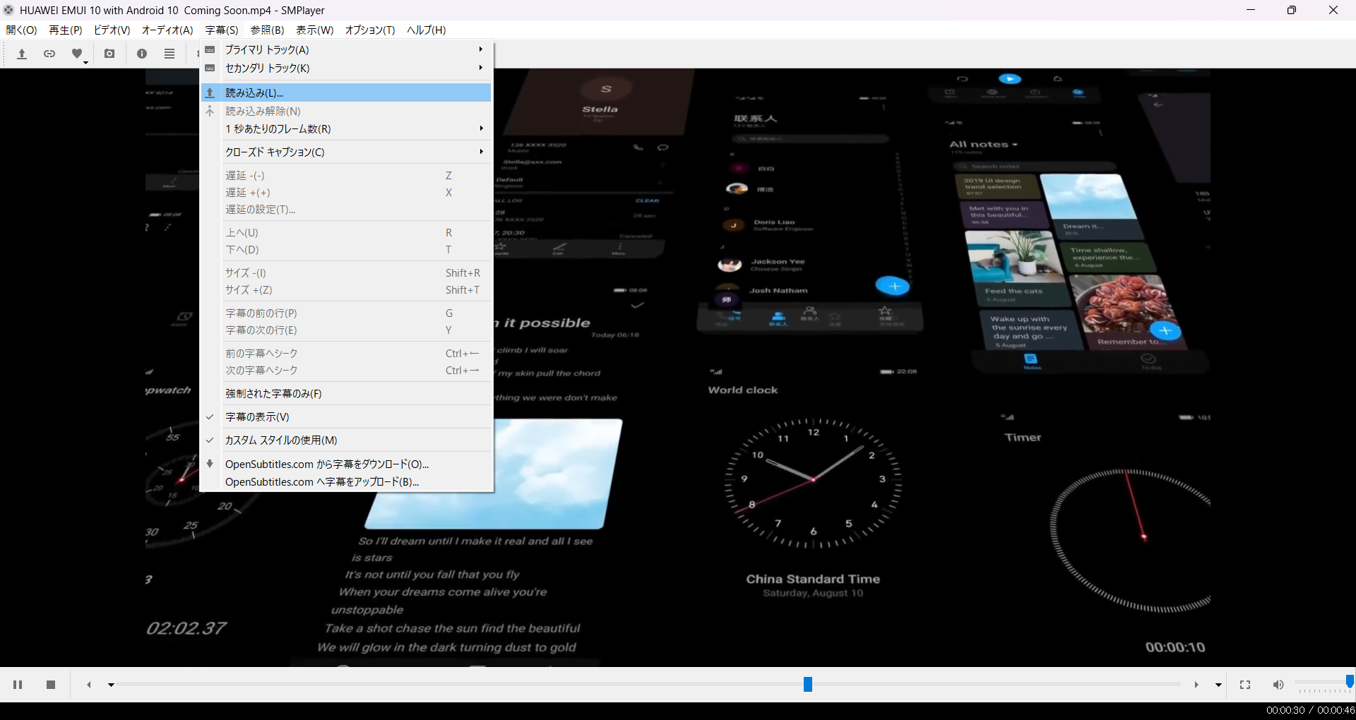 もちろん、字幕ファイルを用意すれば、DVD以外の動画ファイルでも字幕を2つ表示することができます。動画を開いてから、読み込みを選んで選択してください。同じフォルダに同名で保存しておいて自動で読み込ませたり、OpenSubtitlesからダウンロードしたりすることも可能です。