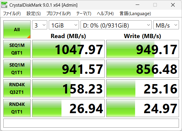 カタログスペック通り、1000MB/s出ています。