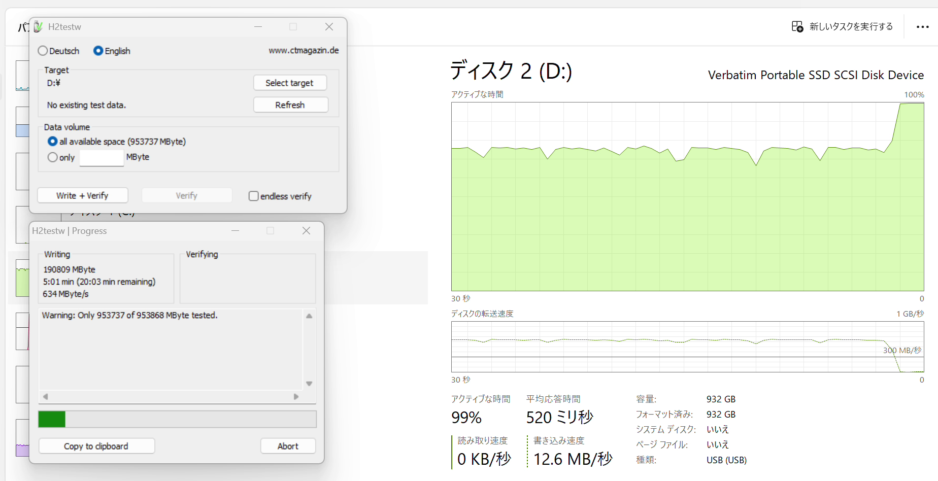 600MB/sで始まり、しばらく安定して書き込めます。