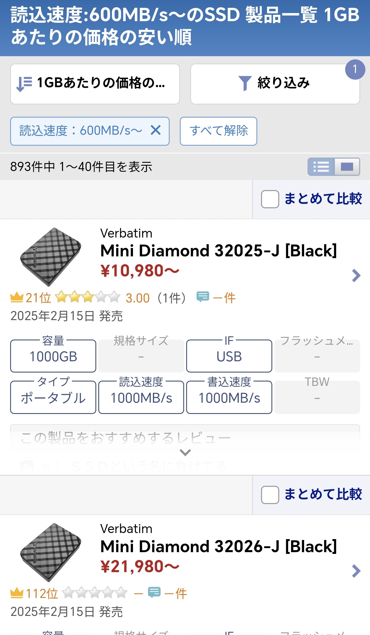1位に出てくるのが、Verbatim Mini Diamondの1TBモデルでした。1TBあたり1万円程度で、高騰前の水準を保っているといえます。